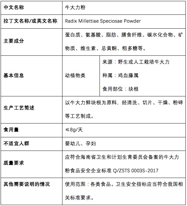 本次申報的新食品原料牛大力粉的使用范圍為單獨食用,或者添加到各類食品中使用。牛大力作為一種健康滋補食材,具有強筋壯骨、抗疲勞、無毒無副作用的特點,攝入人群無明確的限制。根據(jù)對牛大力進行的一系列安全性考察,在最大食用劑量為8.0g/天時是安全的。所以在此次申請中我們推薦為牛大力粉食用量為每日≤8g。