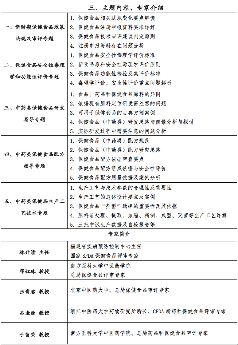 2018年6月1日-3日,我司組織的“中藥類保健食品研發(fā)與技術(shù)審評專題會”專題培訓(xùn)會在廈門成功舉辦。本次培訓(xùn)會邀請了林升清、鄧紅珠、張貴軍、呂圭源、于留榮五位CFDA權(quán)威評審專家出席。政策利好,加之我國豐富的中藥資源和源遠(yuǎn)流長的“藥食同源”文化為中藥類保健食品的研發(fā)提供了基礎(chǔ)。但保健食品的安全性、功能性和質(zhì)量可控性仍是困擾產(chǎn)品研發(fā)及企業(yè)發(fā)展的關(guān)鍵所在。為此,我們特邀請行業(yè)知名專家召開本次交流會,并就法規(guī)、研發(fā)、配方、毒理安全、生產(chǎn)工藝等方面作專題答疑指導(dǎo)交流。