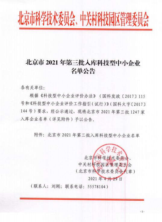 近日,北京市科學(xué)技術(shù)委員會(huì)公示2021年第三批入庫科技型中小企業(yè)公示名單,我公司繼2018年被認(rèn)定為“北京市科技型中小企業(yè)”和2019年第一批入庫科技型中小企業(yè),再次獲此稱號(hào),這是我公司研究開發(fā)服務(wù)取得的又一喜人成果,是我公司走向科技型企業(yè)發(fā)展的一個(gè)巨大突破,更是有關(guān)政府部門對(duì)我司研發(fā)和技術(shù)服務(wù)的充分認(rèn)可。