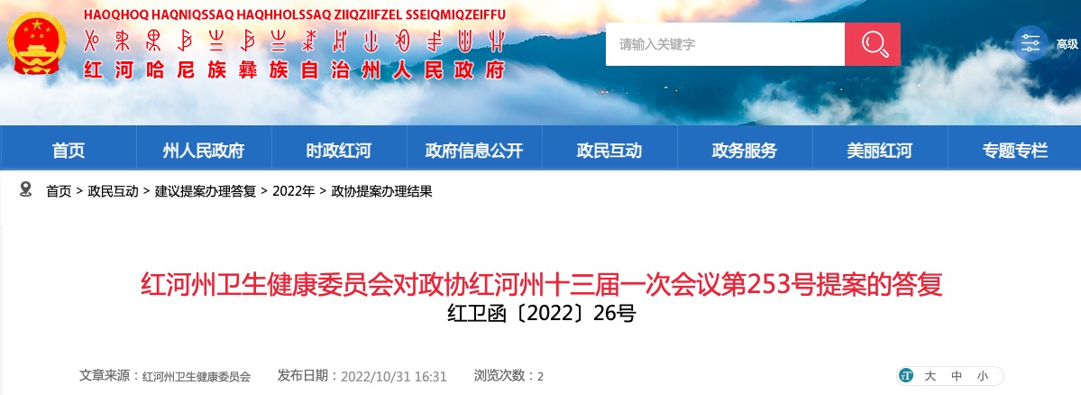紅河州衛(wèi)生健康委員會對政協(xié)紅河州十三屆一次會議第253號提案的答復(fù)
