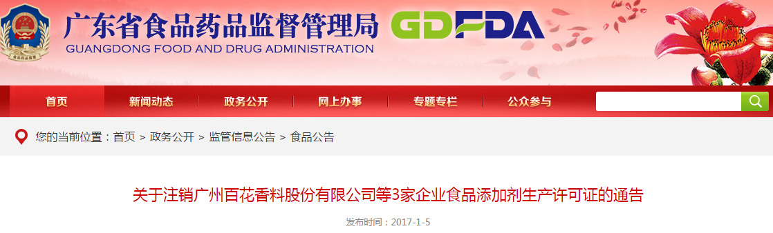 根據(jù)《中華人民共和國(guó)行政許可法》和《食品生產(chǎn)許可管理辦法》(國(guó)家食品藥品監(jiān)督管理總局令第16號(hào))的有關(guān)規(guī)定,我局決定注銷廣州百花香料股份有限公司等3家企業(yè)的3張食品添加劑生產(chǎn)許可證(名單見(jiàn)附件)。