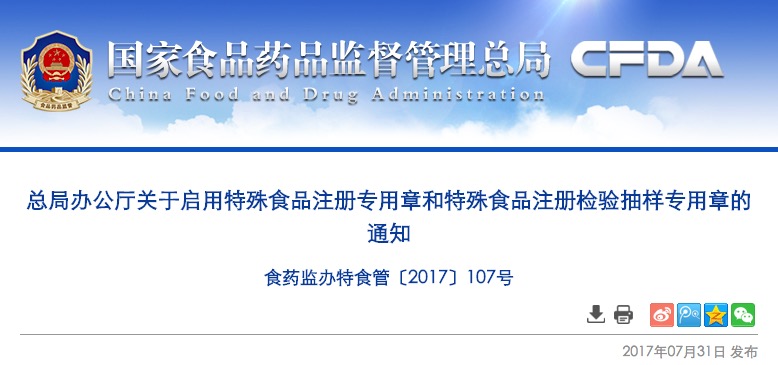 根據(jù)《保健食品注冊(cè)與備案管理辦法》(國(guó)家食品藥品監(jiān)督管理總局令第22號(hào))、《特殊醫(yī)學(xué)用途配方食品注冊(cè)管理辦法》(國(guó)家食品藥品監(jiān)督管理總局令第24號(hào))和《嬰幼兒配方乳粉產(chǎn)品配方注冊(cè)管理辦法》(國(guó)家食品藥品監(jiān)督管理總局令第26號(hào)),自2017年8月1日起,啟用“國(guó)家食品藥品監(jiān)督管理總局特殊食品注冊(cè)專(zhuān)用章(1)”用于保健食品注冊(cè),“國(guó)家食品藥品監(jiān)督管理總局特殊食品注冊(cè)專(zhuān)用章(2)”用于特殊醫(yī)學(xué)用途配方食品和嬰幼兒配方乳粉產(chǎn)品配方注冊(cè),“國(guó)家食品藥品監(jiān)督管理總局特殊食品注冊(cè)檢驗(yàn)抽樣專(zhuān)用章”用于特殊食品抽樣。