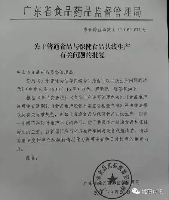 2016年9月,廣東省食藥監(jiān)局批復(fù)中山市食藥監(jiān)局“關(guān)于普通食品與保健食品共線生產(chǎn)的有關(guān)問題”一函被公開。此函中明確指出“未禁止普通食品與保健食品共線生產(chǎn),但同一車間不得同時(shí)生產(chǎn)不同的產(chǎn)品”。