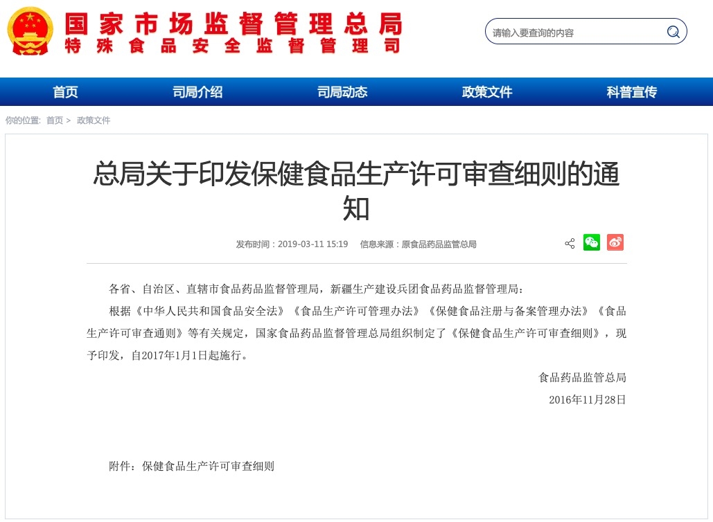 1.3.1國家食品藥品監(jiān)督管理總局負(fù)責(zé)制定保健食品生產(chǎn)許可審查標(biāo)準(zhǔn)和程序,指導(dǎo)各省級食品藥品監(jiān)督管理部門開展保健食品生產(chǎn)許可審查工作。