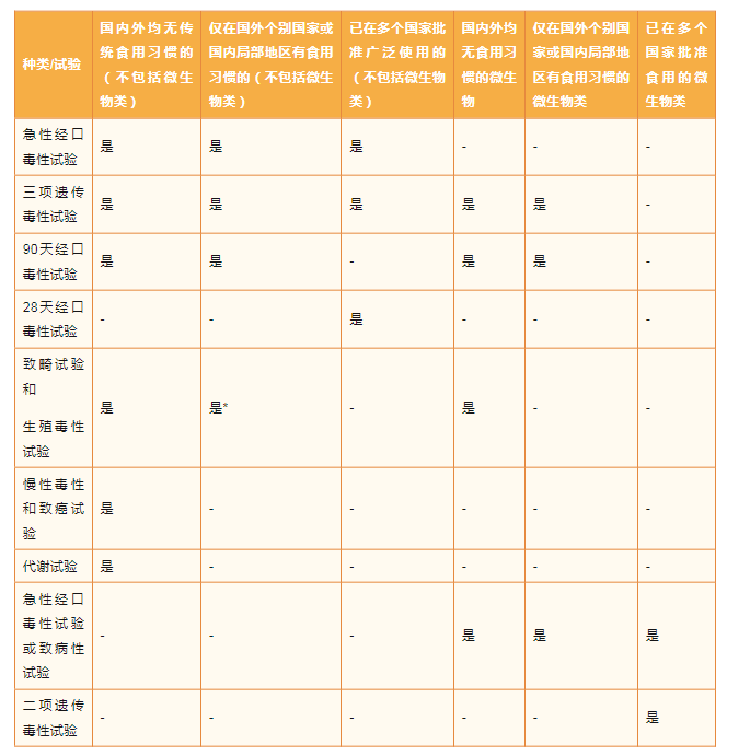 2)食品添加劑新品種,按照GB 15193.1-2016可分為香料、酶制劑和其他食品添加劑來(lái)劃分,各種類(lèi)所需的試驗(yàn)匯總?cè)缦拢?/p>