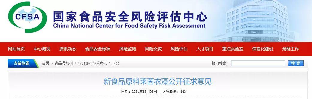 受國家衛(wèi)生健康委員會委托,根據(jù)《食品安全法》和《新食品原料安全性審查管理辦法》的規(guī)定,萊茵衣藻申報新食品原料已通過專家評審委員會技術(shù)審查,現(xiàn)公開征求意見,請于2022年1月8日前將意見反饋至我中心,逾期將不予處理。